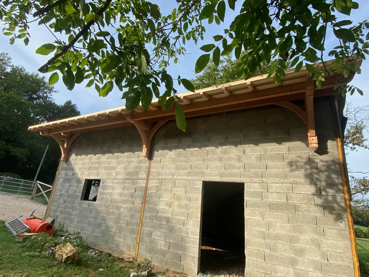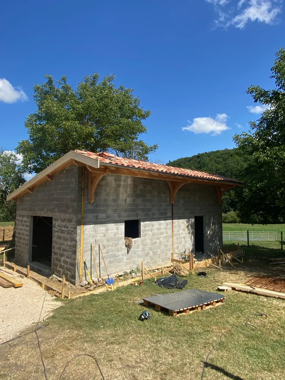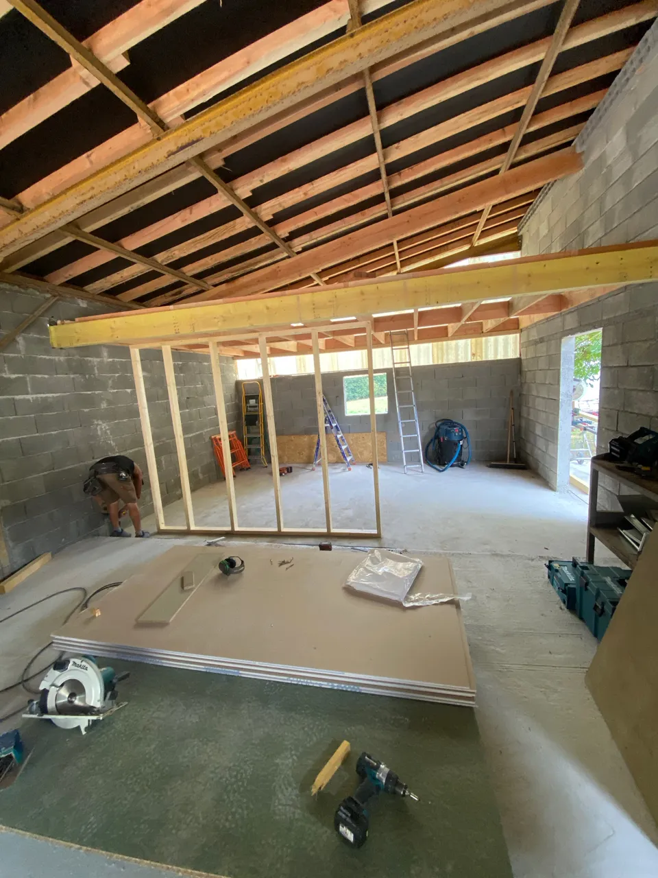 Démolition, ouvertures, dalles béton, pose de menuiseries, fabrication porte coulissante, charpente traditionnelle, lambris peuplier, ossature bois isolée laine de bois, placo, couverture tuile mécanique emboitement, zinguerie, habillage de bandeaux, couloir zinc, girouette, ornements, habillage tableaux zinc, chêneau encaissé, habillage acrotère, extension ossature bois toit plat, bardage vertical claire voie douglas.