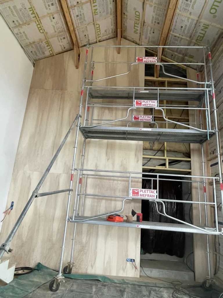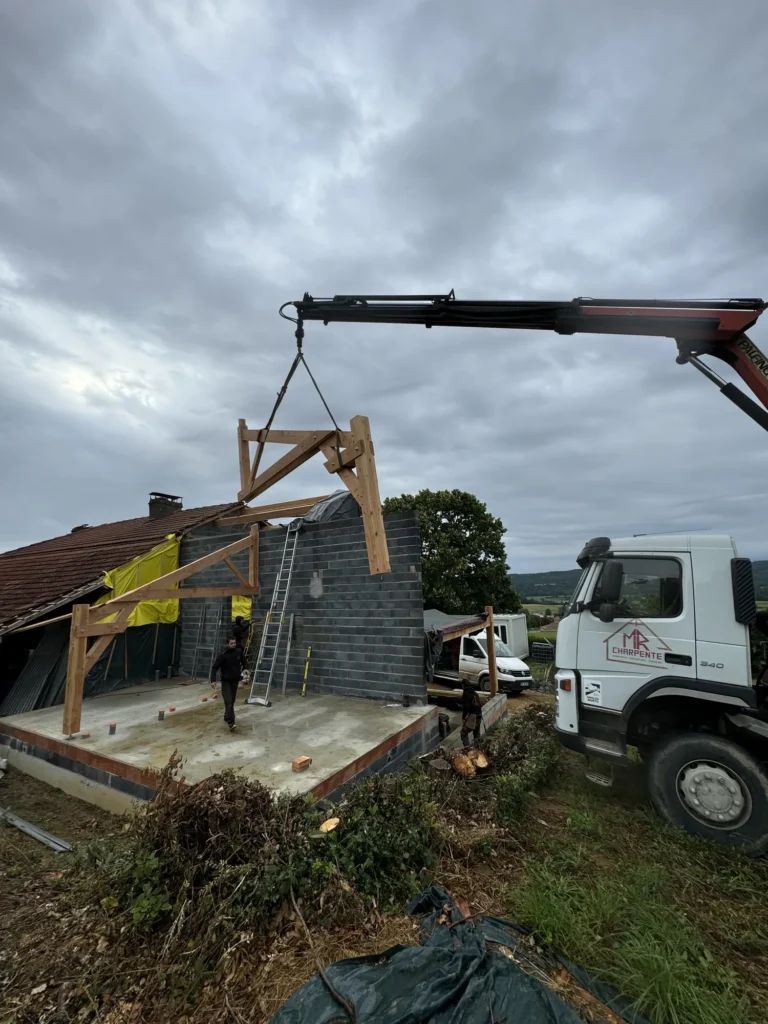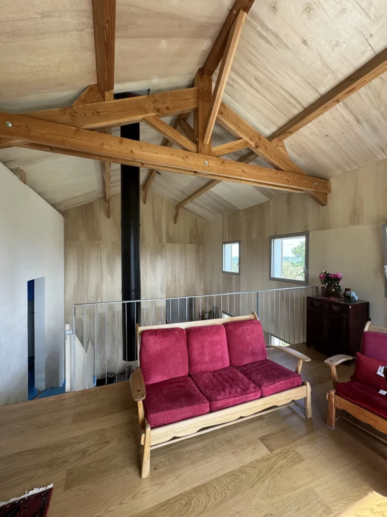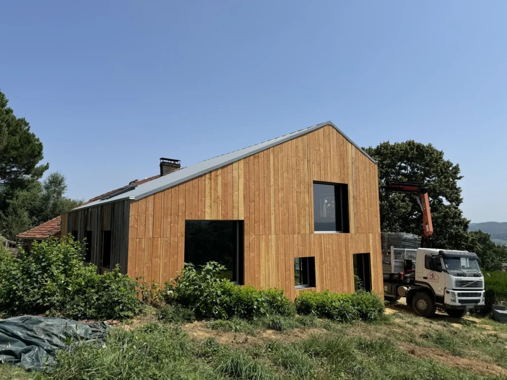 Charpente traditionnelle, isolation fibre de bois, sarking, bardages claire voie, escalier bois, parquet massif, finition intérieure, zinguerie, chêneaux encaissés, couverture joint debout bac acier