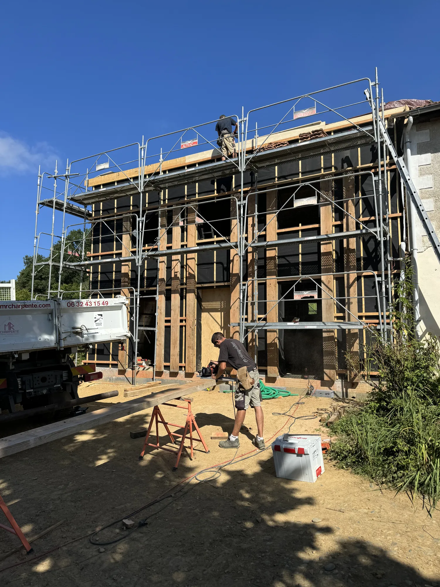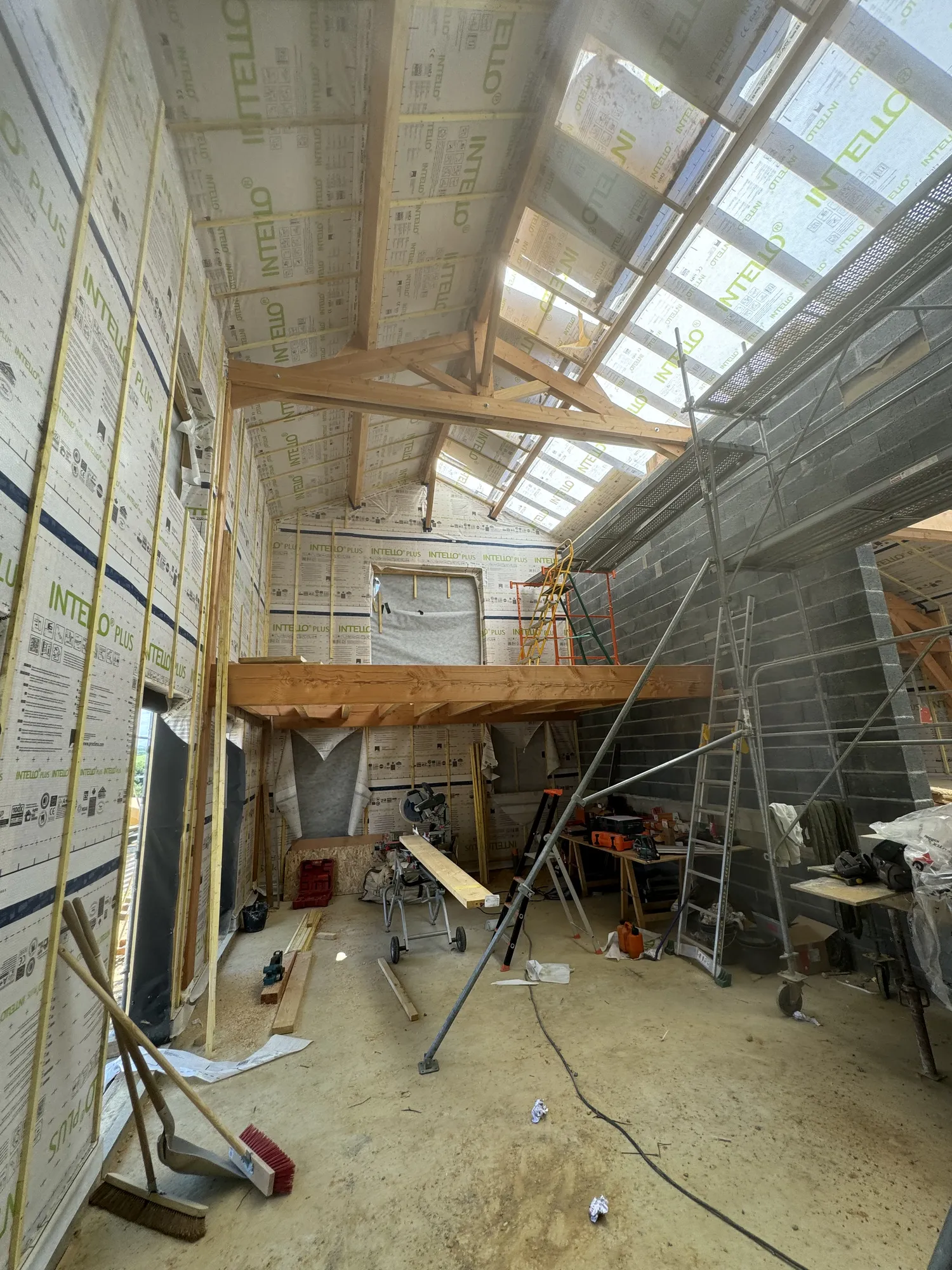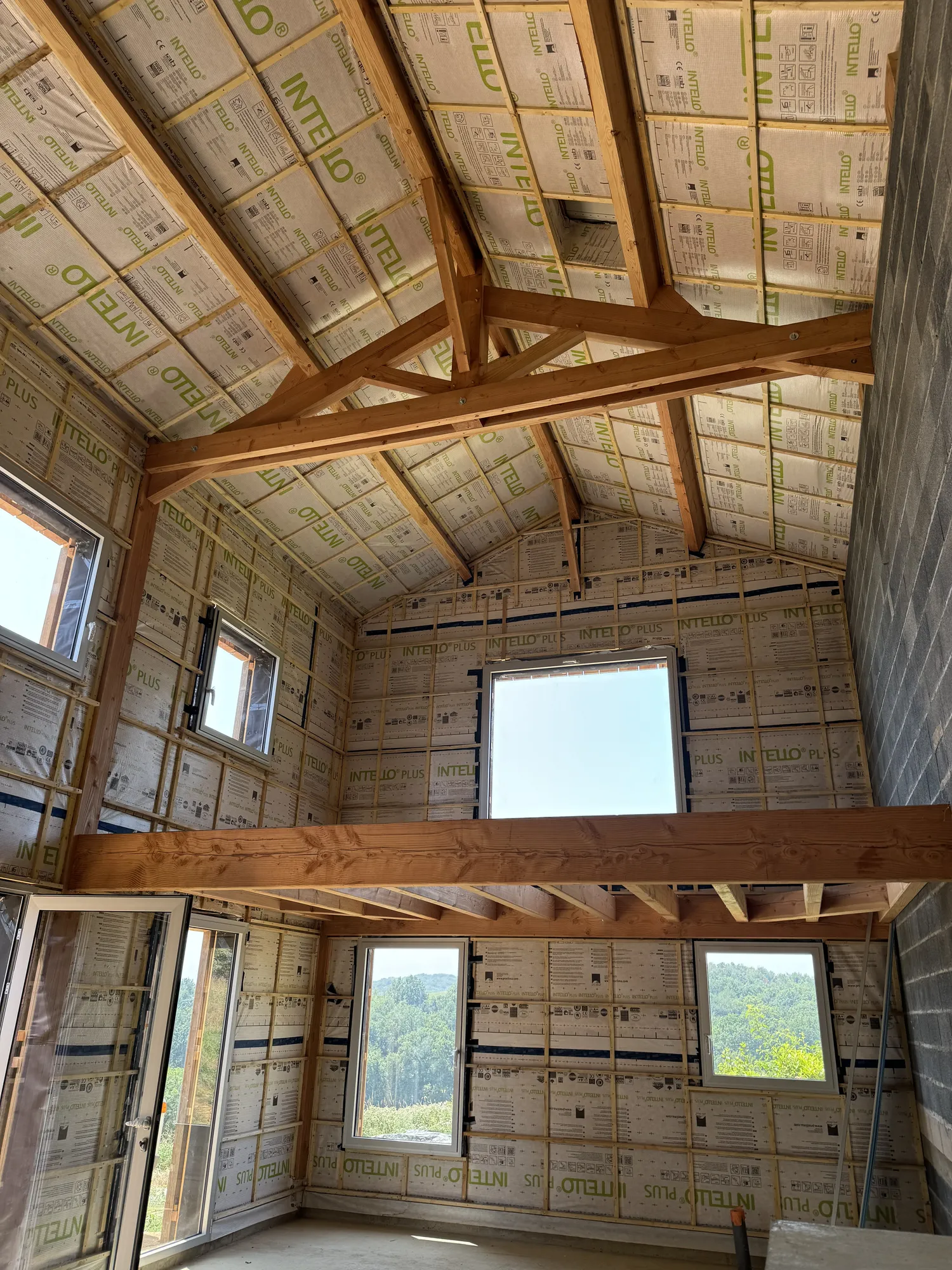 Charpente traditionnelle, isolation fibre de bois, sarking, bardages claire voie, escalier bois, parquet massif, finition intérieure, zinguerie, chêneaux encaissés, couverture joint debout bac acier